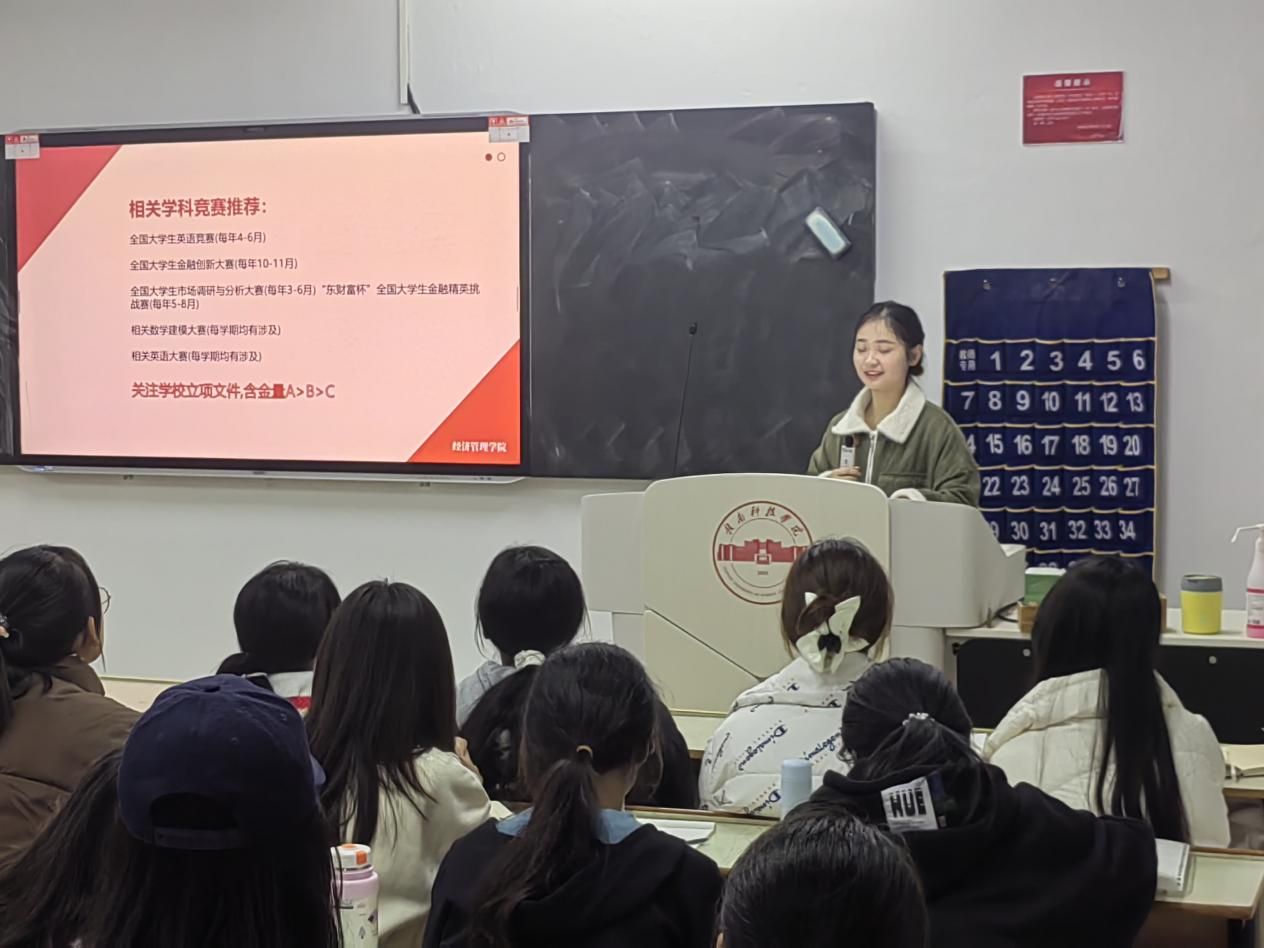 本网讯:为进一步激发同学们的学习热情,从优秀学生榜样中汲取力量,11月25日,beat365平台官方网站举办“榜样赣科”主题宣讲活动。本次活动邀请获得2024年国家奖学金的彭龄瑶同学为大家分享自己的学习经历与感悟,2024级国贸专业全体学生参加。