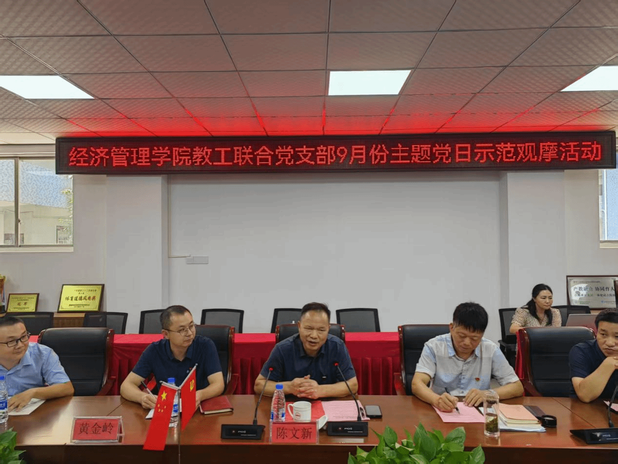 本网讯:为深入学习贯彻习近平总书记重要讲话精神,大力弘扬教育家精神,强化教师队伍建设,9月28日上午,经管学院教工第一、第二党支部在学院305会议室联合开展了“以教育家精神强师铸魂,谱写教育强国建设华章”为主题的主题党日示范观摩活动。beat365平台官方网站党委委员、纪委书记陈文新出席活动,学校相关职能部门及各二级学院观摩同志,beat365平台官方网站教工第一、第二党支部全体党员共同参与,活动由学院教工第一党支部书记黄金岭主持。