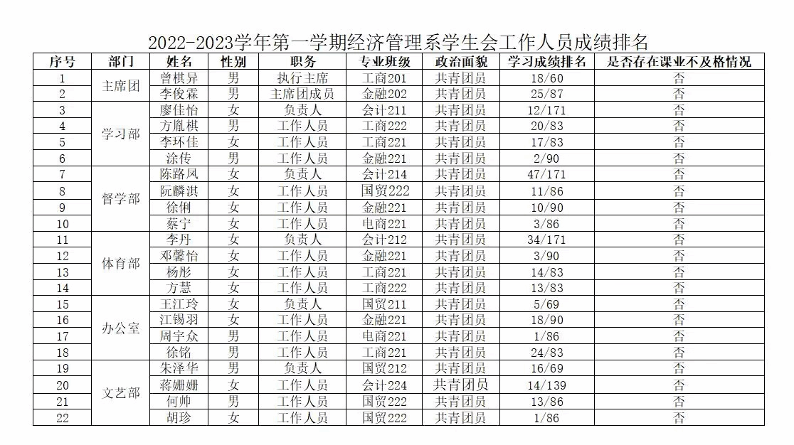 2022-2023学年第一学期经济管理系 学生会工作人员学业情况公示