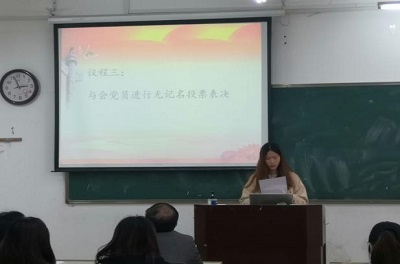 大会审议、讨论、表决谢颖芝等13名同志的党员发展问题。会议伊始,由每位发展对象依次上台汇报自身基本情况,阐述自身对党的认识、入党动机、学习和工作履历等情况,表明自己志愿加入中国共产党的态度。随后由支部的两位入党介绍人分别介绍了该13位候选发展对象的相关情况,并表示愿意推荐其入党,同意吸收其为预备党员的意见。同时,参会的各位正式党员进行民主评议,采用无记名投票形式进行表决,并公布表决结果。经无记名投票,参会的二支部所有正式党员全票通过,一致同意谢颖芝等13名同志由发展对象转为中共预备党员。吸收大会表决结束后,全体党员同志面对党旗进行宣誓,重温入党誓词,向大会表达了自身的想法与决心。