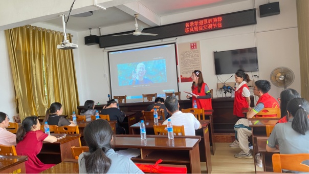 之后,“乘风破浪”队来到横江村,与当地村委组织开展了移风易俗活动,动员广大群众破除陈规陋习,以实际行动倡导和弘扬社会文明新风尚。他们把移风易俗教育与公民思想道德教育结合起来,通过穿插案例、展示图画、播放微电影的方式,为村民解读移风易俗的重大意义并引导广大群众文明健康的生活理念,自觉践行移风易俗,弘扬文明新风气。