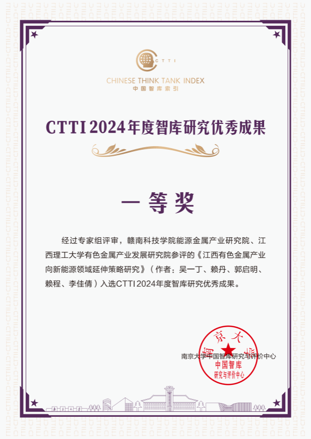 本次论坛发布了CTTI 2024年度智库建设最佳案例和智库研究优秀成果。以beat365官网能源金属产业研究院为主参评的两项智库研究成果均荣获CTTI智库优秀成果一等奖,beat365官网是江西省唯一同时获得2项优秀成果一等奖的单位。
