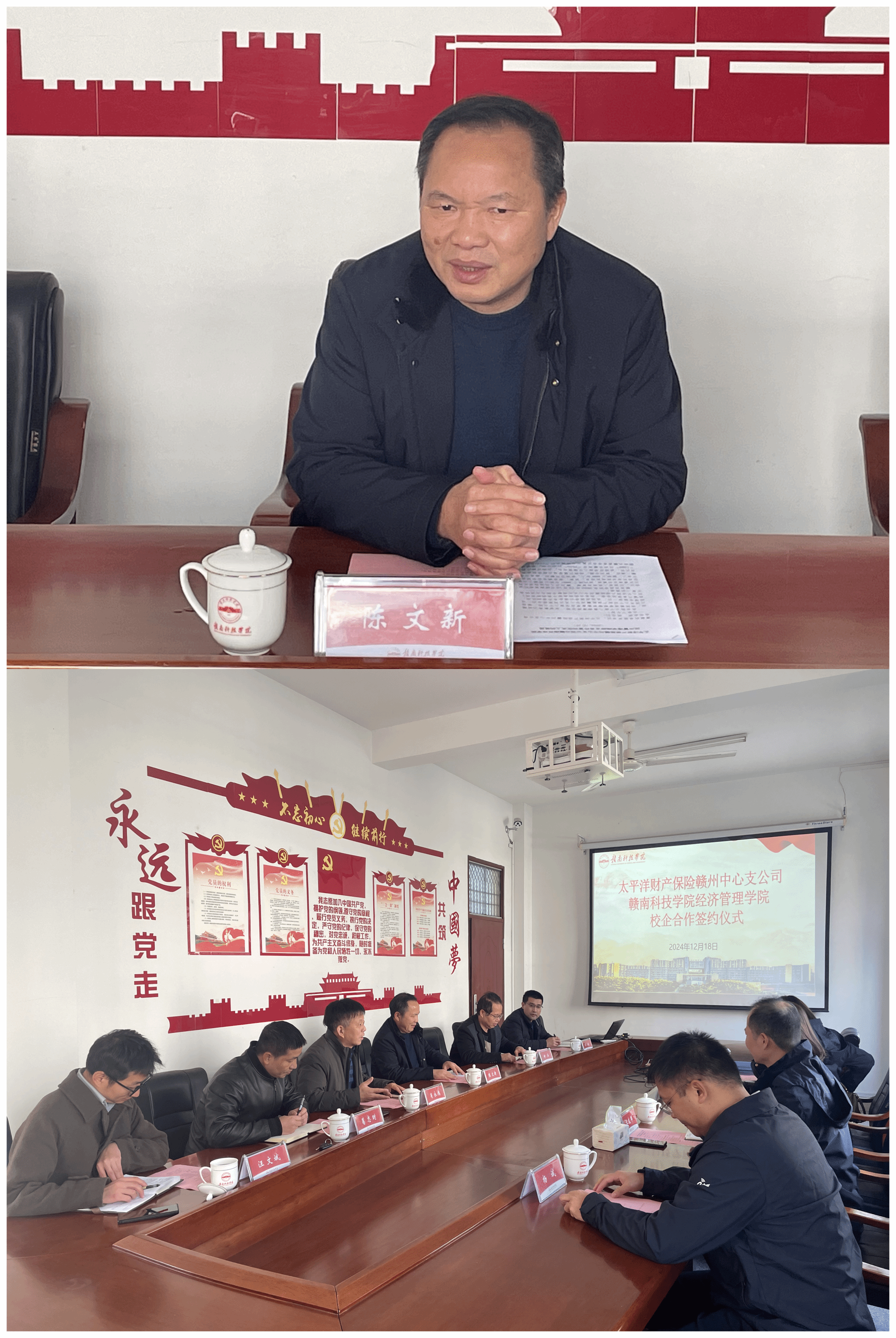 签约仪式上,陈文新对李桂芳一行的到来表示热烈欢迎,并从学校发展历程、学科建设、科研平台、师资队伍、产教融合等方面进行介绍,陈文新指出此次校企座谈会合作成功签约,是加强校企间互通互信互融互惠互赢的良好契机,学校将围绕企业人才需求、技术需求等,提供解决方案,实现互利共赢。李桂芳介绍太平洋财产保险赣州中心支公司基本情况,她表示希望双方能在人才培养、实践基地共建等多个方面加强全方位深层次合作。双方就未来合作方向达成了共识。
