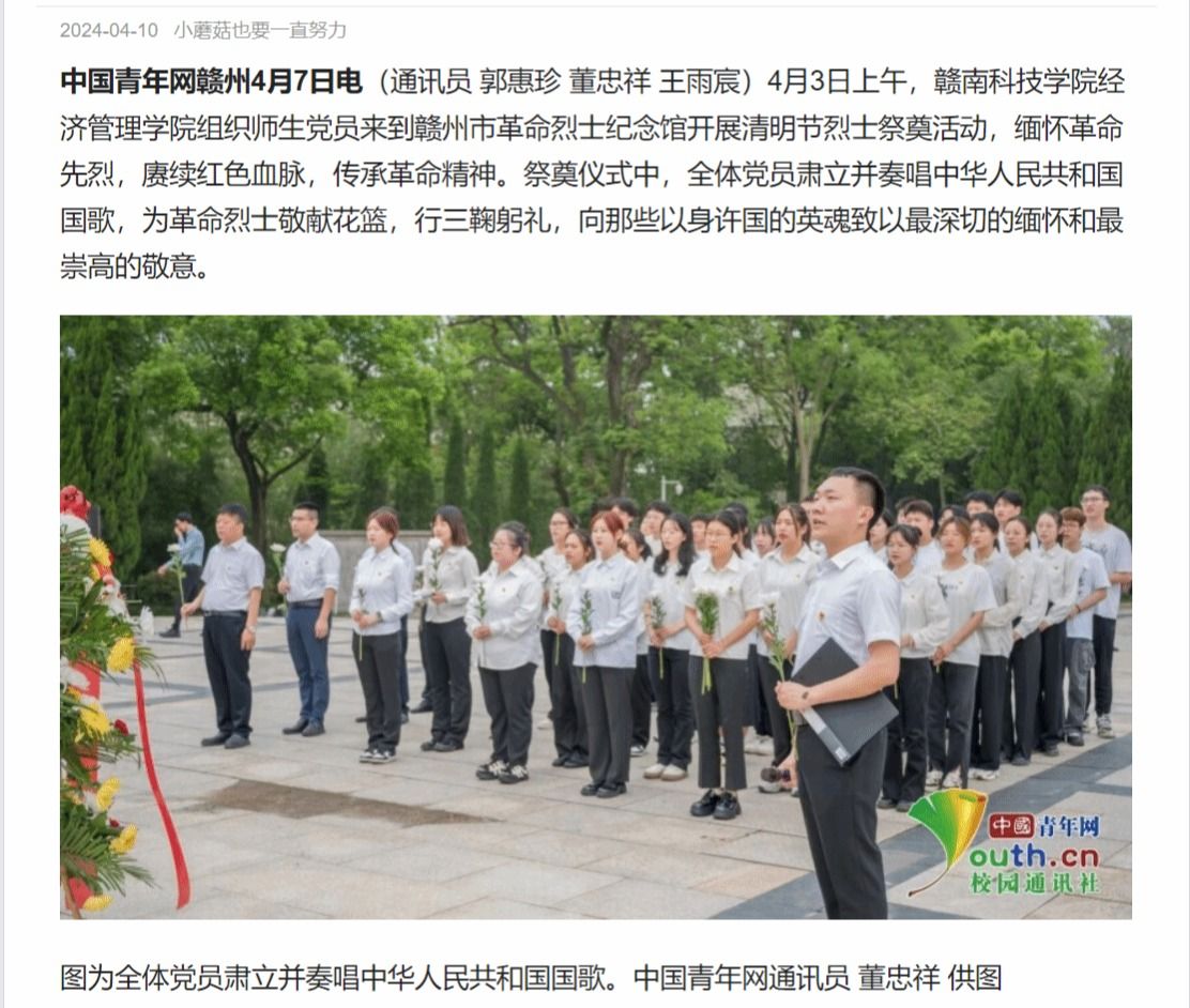 中国青年网赣州4月7日电(通讯员 郭惠珍 董忠祥 王雨宸)4月3日上午,beat365平台官方网站beat365平台官方网站组织师生党员来到赣州市革命烈士纪念馆开展清明节烈士祭奠活动,缅怀革命先烈,赓续红色血脉,传承革命精神。祭奠仪式中,全体党员肃立并奏唱中华人民共和国国歌,为革命烈士敬献花篮,行三鞠躬礼,向那些以身许国的英魂致以最深切的缅怀和最崇高的敬意。