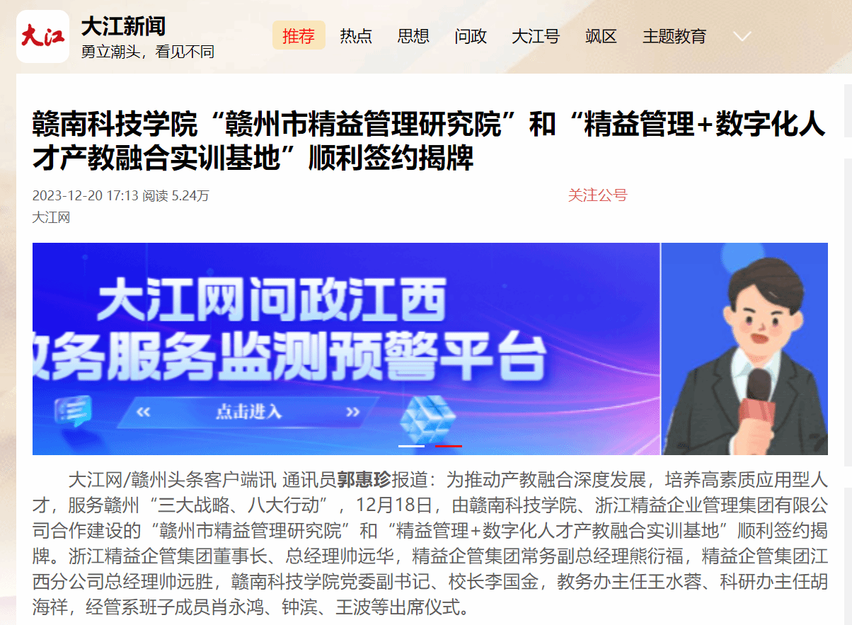 大江网/赣州头条客户端讯 通讯员郭惠珍报道:为推动产教融合深度发展,培养高素质应用型人才,服务赣州“三大战略、八大行动”,12月18日,由beat365平台官方网站、浙江精益企业管理集团有限公司合作建设的“赣州市精益管理研究院”和“精益管理+数字化人才产教融合实训基地”顺利签约揭牌。浙江精益企管集团董事长、总经理帅远华,精益企管集团常务副总经理熊衍福,精益企管集团江西分公司总经理帅远胜,beat365平台官方网站党委副书记、校长李国金,教务办主任王水蓉、科研办主任胡海祥,经管系班子成员肖永鸿、钟滨、王波等出席仪式。