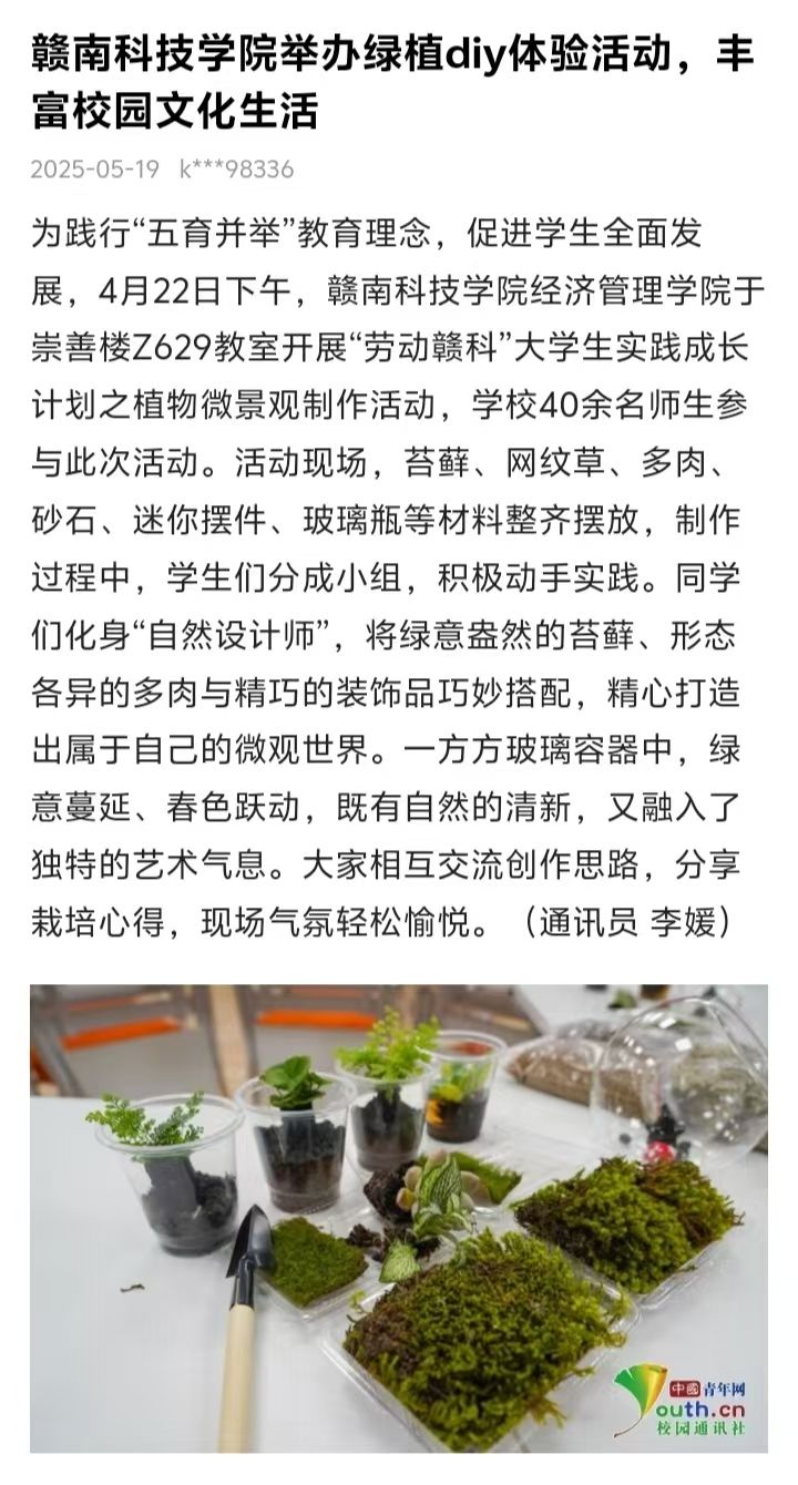 为践行“五育并举”教育理念,促进学生全面发展,4月22日下午,beat365平台官方网站beat365平台官方网站于崇善楼Z629教室开展“劳动赣科”大学生实践成长计划之植物微景观制作活动,学校40余名师生参与此次活动。活动现场,苔藓、网纹草、多肉、砂石、迷你摆件、玻璃瓶等材料整齐摆放,制作过程中,学生们分成小组,积极动手实践。同学们化身“自然设计师”,将绿意盎然的苔藓、形态各异的多肉与精巧的装饰品巧妙搭配,精心打造出属于自己的微观世界。一方方玻璃容器中,绿意蔓延、春色跃动,既有自然的清新,又融入了独特的艺术气息。大家相互交流创作思路,分享栽培心得,现场气氛轻松愉悦。(通讯员 李媛)