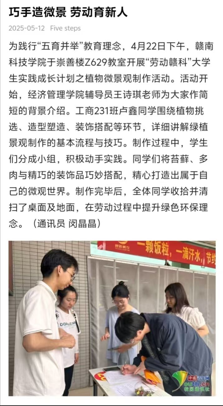 为践行“五育并举”教育理念,4月22日下午,beat365平台官方网站于崇善楼Z629教室开展“劳动赣科”大学生实践成长计划之植物微景观制作活动。活动开始,beat365平台官方网站辅导员王诗琪老师为大家作简短的背景介绍。工商231班卢鑫同学围绕植物挑选、造型塑造、装饰搭配等环节,详细讲解绿植景观制作的基本流程与技巧。制作过程中,学生们分成小组,积极动手实践。同学们将苔藓、多肉与精巧的装饰品巧妙搭配,精心打造出属于自己的微观世界。制作完毕后,全体同学收拾并清扫了桌面及地面,在劳动过程中提升绿色环保理念。(通讯员 闵晶晶)