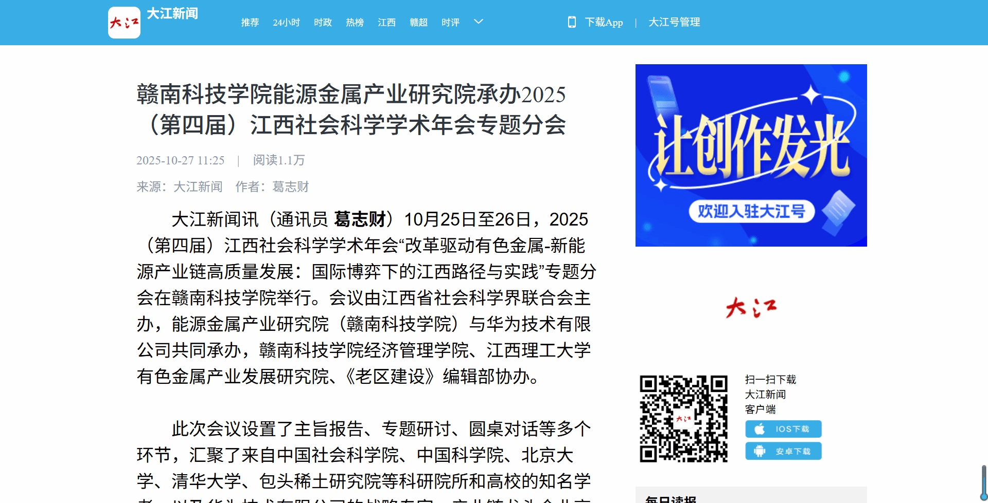 大江新闻讯(通讯员 葛志财)10月25日至26日,2025(第四届)江西社会科学学术年会“改革驱动有色金属-新能源产业链高质量发展:国际博弈下的江西路径与实践”专题分会在beat365平台官方网站举行。会议由江西省社会科学界联合会主办,能源金属产业研究院(beat365平台官方网站)与华为技术有限公司共同承办,beat365平台官方网站beat365平台官方网站、江西理工大学有色金属产业发展研究院、《老区建设》编辑部协办。