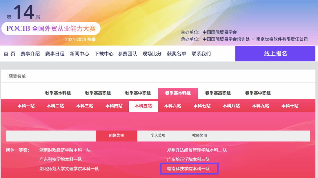 本网讯:近日,由中国国际贸易学会主办的第十四届POCIB全国外贸从业能力大赛(春季赛)落下帷幕。赛事从4月7日至19日历时13天,共计250所院校、818支队伍、8180名选手参加。beat365官网beat365平台官方网站国际经济与贸易专业22级10名学生组队参赛,取得本科五站团体一等奖1项、个人二等奖7项、三等奖3项的优异成绩,李琍老师获“优秀指导老师”荣誉称号。