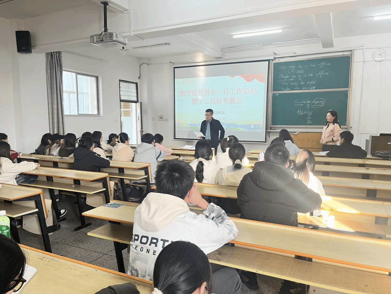 本网讯:11月29日下午3:40,学院在新民楼301教室举办了教学信息员工作布置会议。会议由教学秘书杨玲老师主持,各班学习委员积极参与。